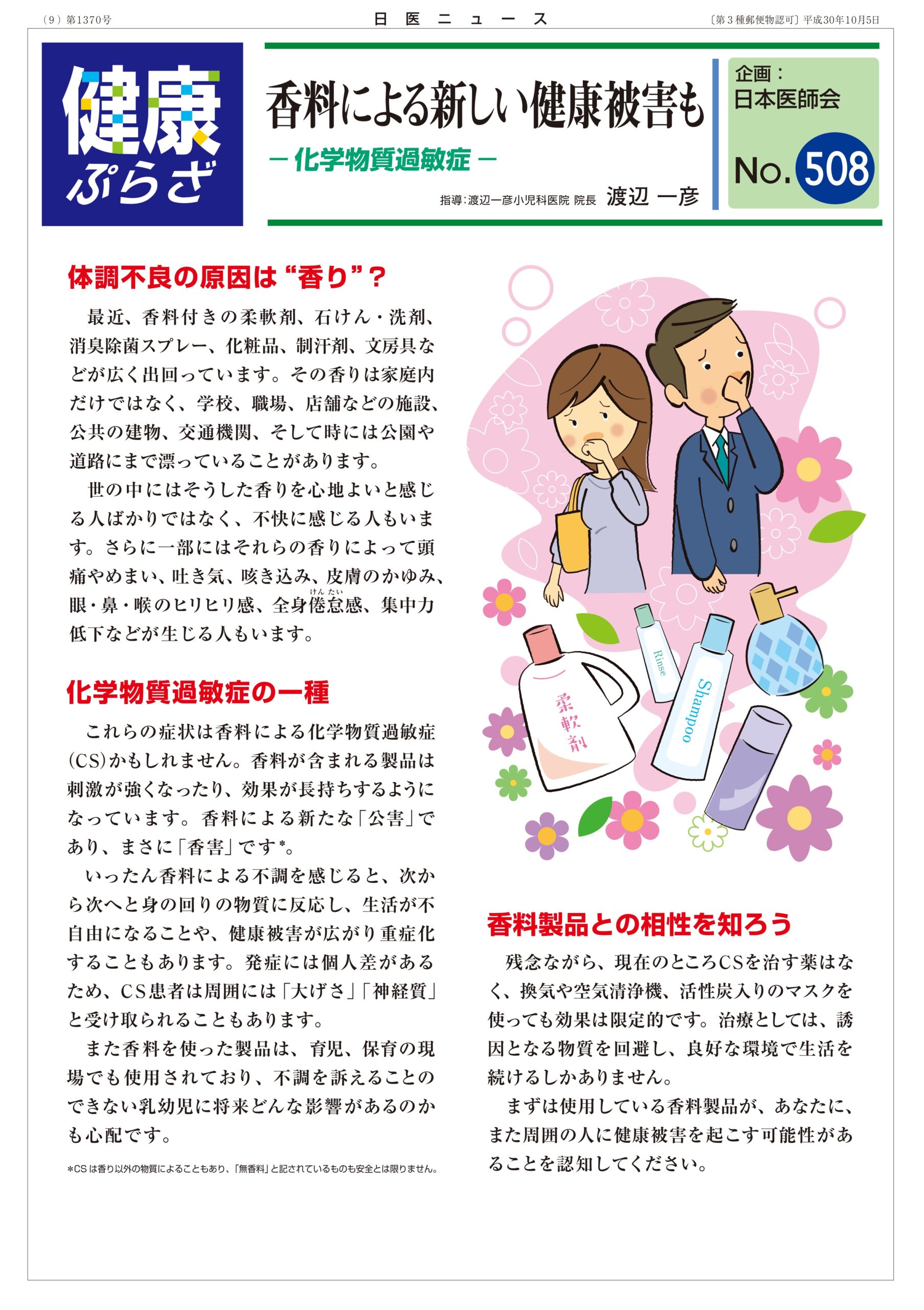 香害は、香水や、合成洗剤・柔軟剤・入浴剤・防虫剤・化粧品・芳香剤などに含まれる合成香料(化学物質)により、不快感などや頭痛、アレルギーなど様々な健康被害が生じることです。人によっては不快感以外に咳・喘息や頭痛、吐き気などの身体症状を伴う場合があり、香料から化学物質過敏症が誘発されたと考えられています。空気中に漂う香り成分への受動的曝露による公害を「香害」と呼ぶようになりました。香料成分をマイクロカプセル化した残香性の高い製品や、洗濯時に香りが強く残る柔軟剤などが香害の発生に関与しています。