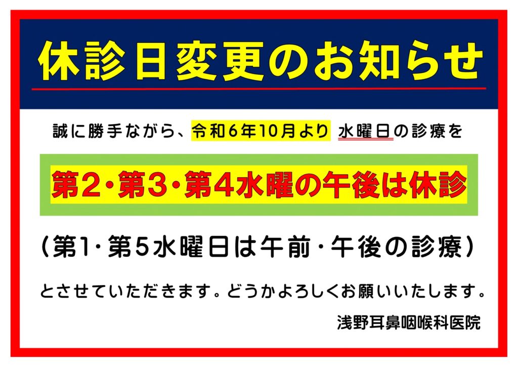 日頃より当院をご利用いただき、誠にありがとうございます。従来の第2・第4水曜午後休診に加え、令和6年10月から第3水曜午後も休診とさせていただきました。なお、第1・第5水曜日は午後も診療いたします。皆様にはご迷惑をおかけいたしますが、ご理解とご協力のほど、何卒よろしくお願い申し上げます。